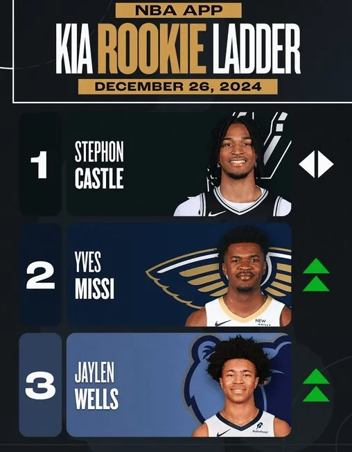 12月27日NBA官方公布了最新一期新秀榜单,其中卡斯尔仍旧位居第一,米西、韦尔斯上升至第二、三。 2024-12-27 10:00:12